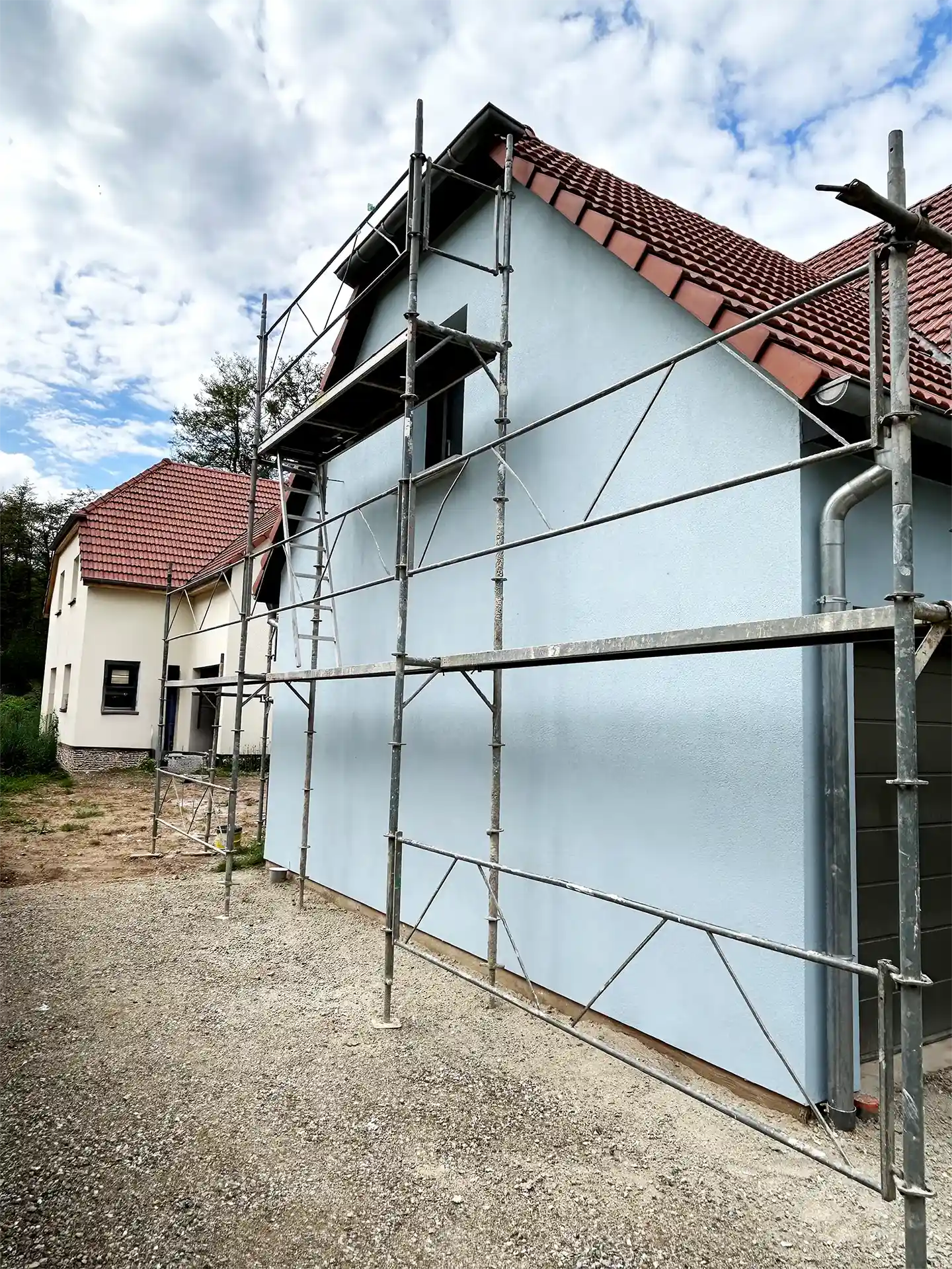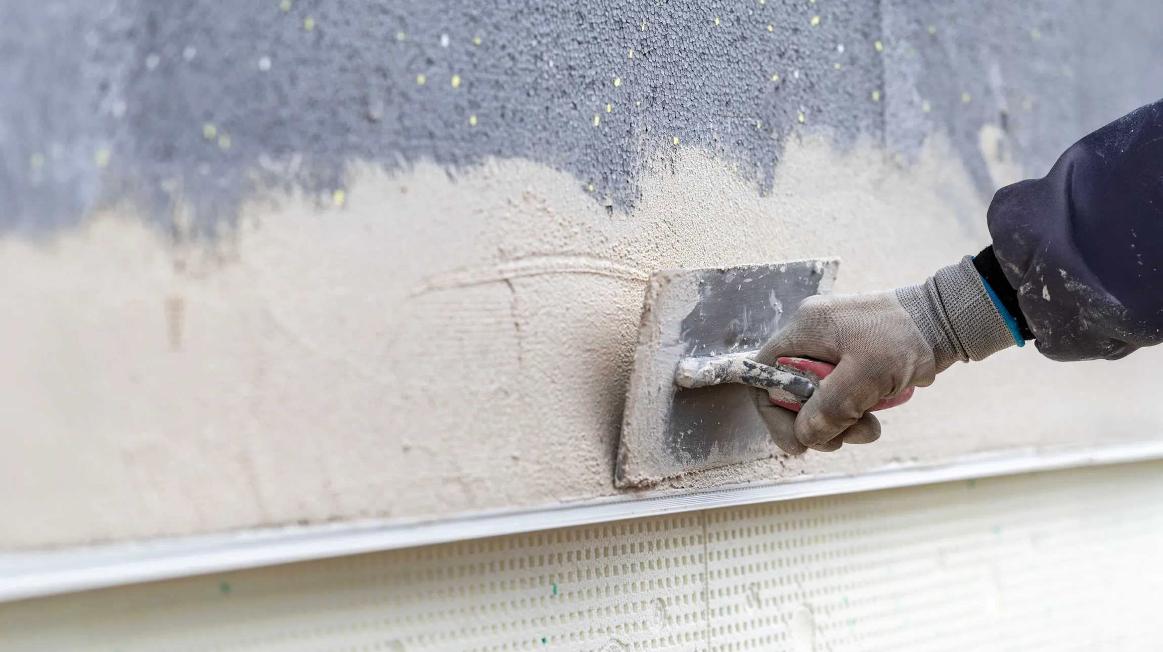 Application d'enduit teinté dans la masse pour une couleur résistante sans entretien supplémentaire.